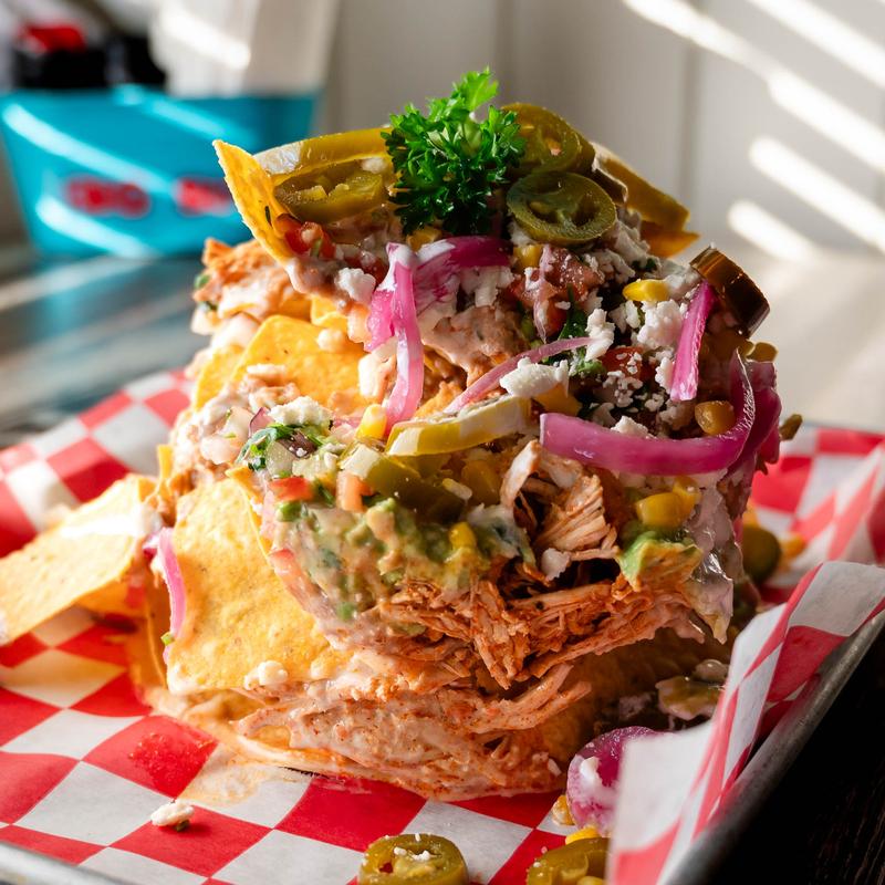 Crispy tortilla chips, refried beans, corn, melted queso sauce, pickled red onion, pico de gallo, guacamole, crema, and jalapeños | Choose: chicken tinga, carnitas or birria.