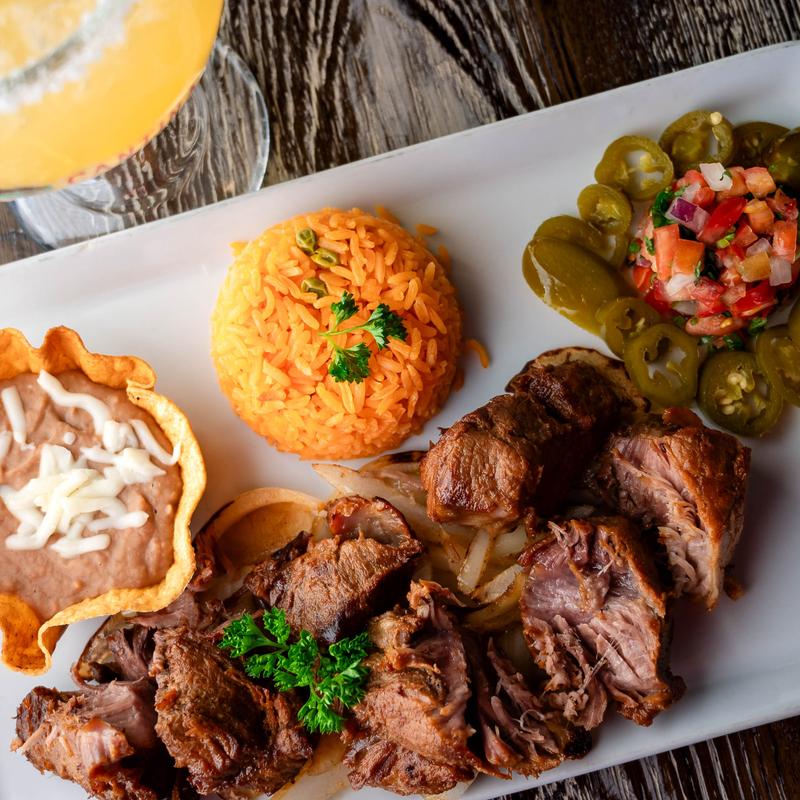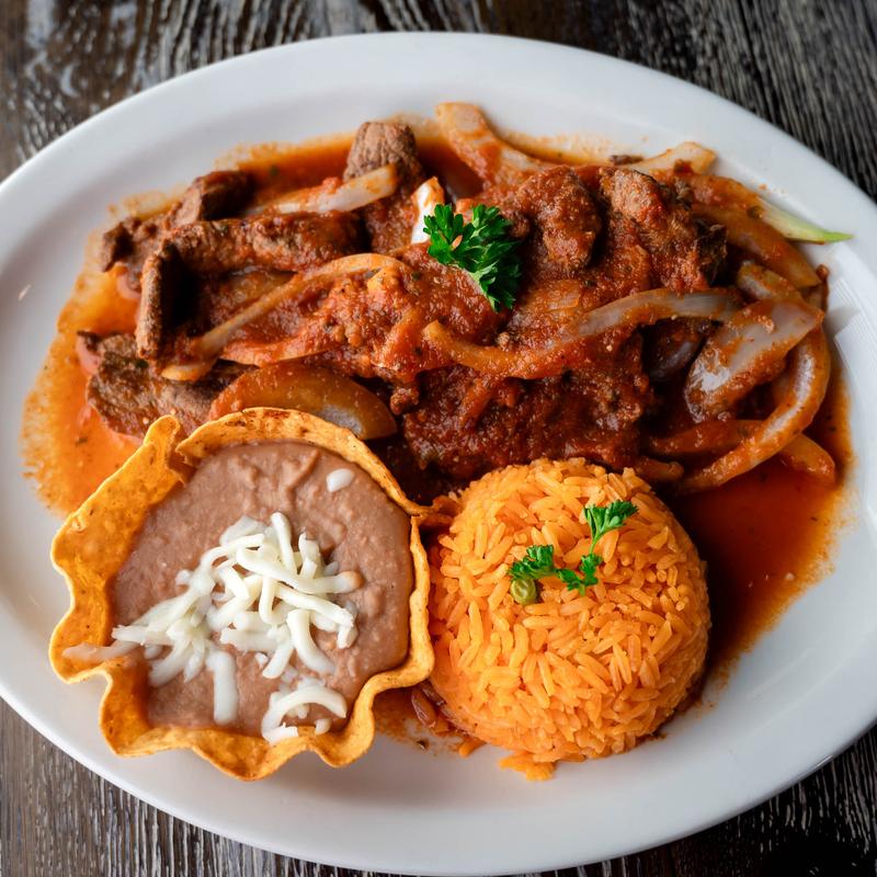 chicken or steak, lettuce Pico de gallo, sour cream, and warm tortillas, side of Mexican rice and refried beans