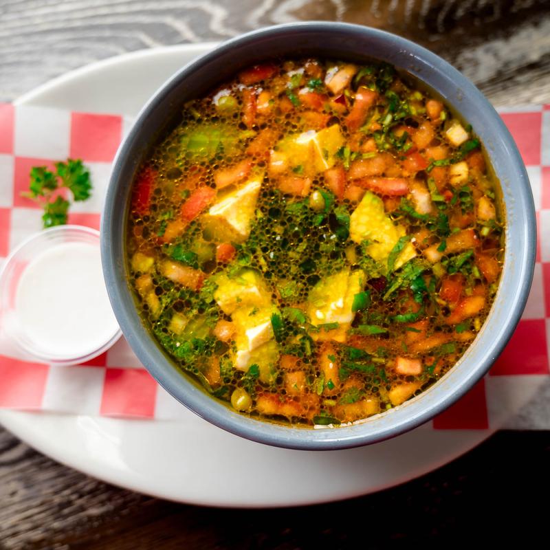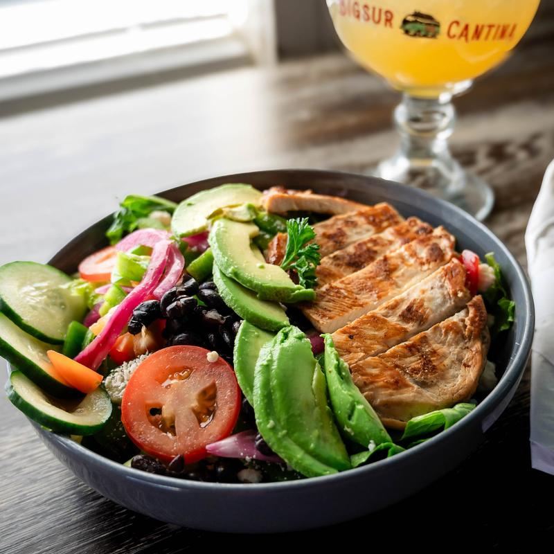 Chopped romaine, diced tomatoes, avocado, cucumber, red onion, black beans, sweet corn, bell pepper, feta cheese, and fresh cilantro with choice of dressing • Add grilled chicken breast +$1.50 | Add steak +$3.00 | Add shrimp +$5.00